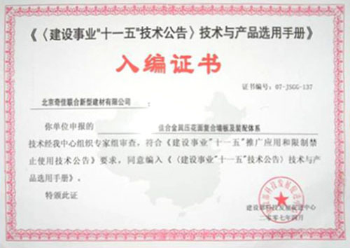 - 2007年被選入《建設業(yè)“十一五” 技術公告技術與產(chǎn)品選用手冊》